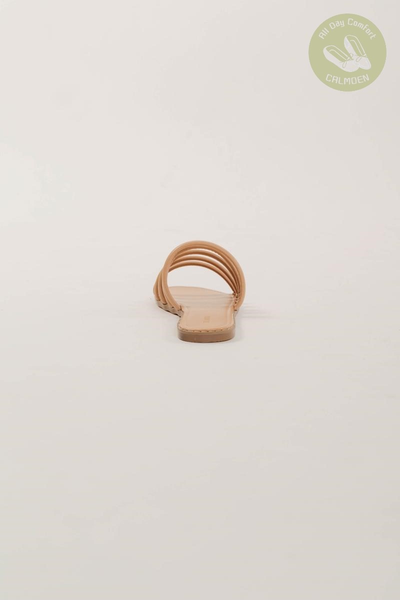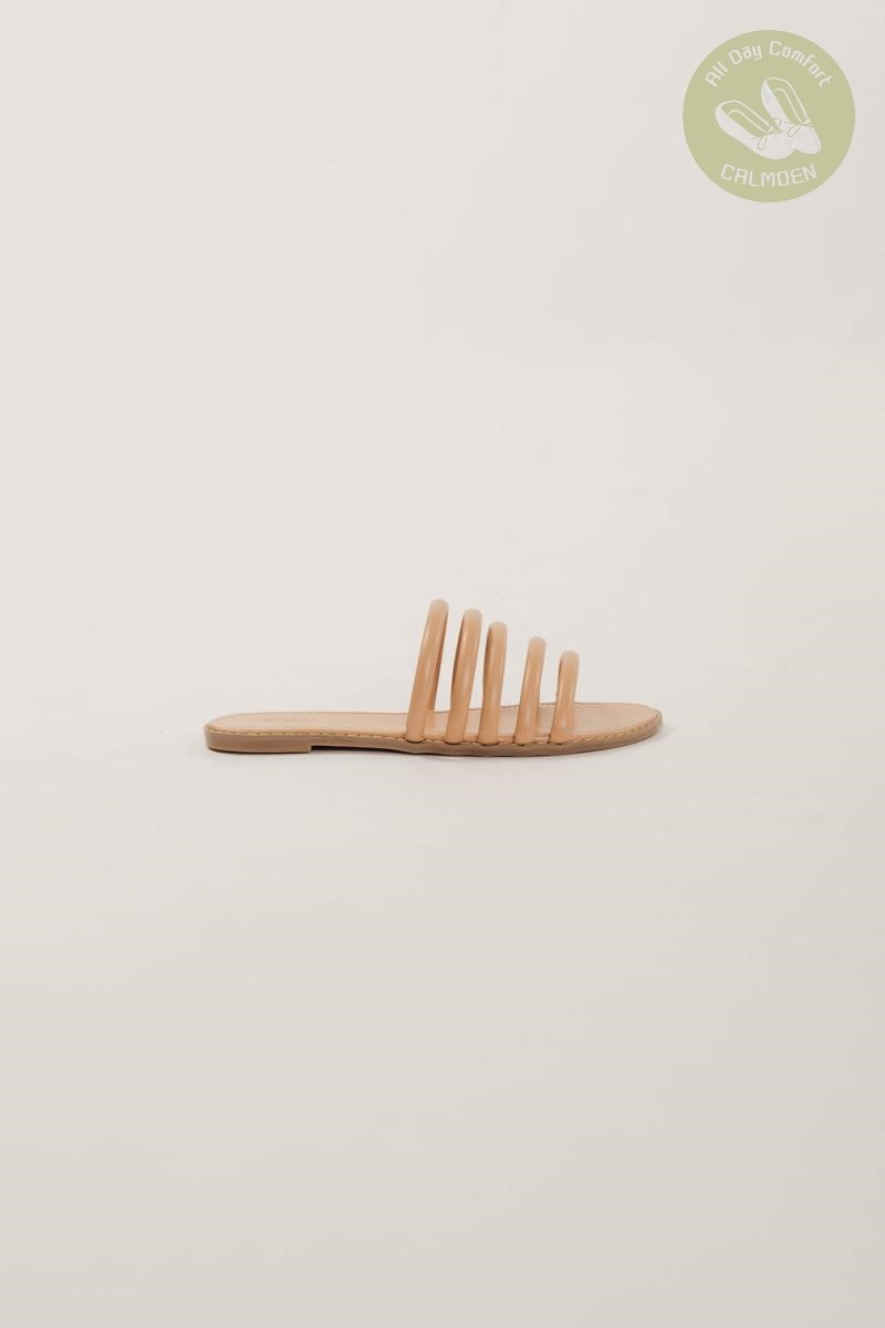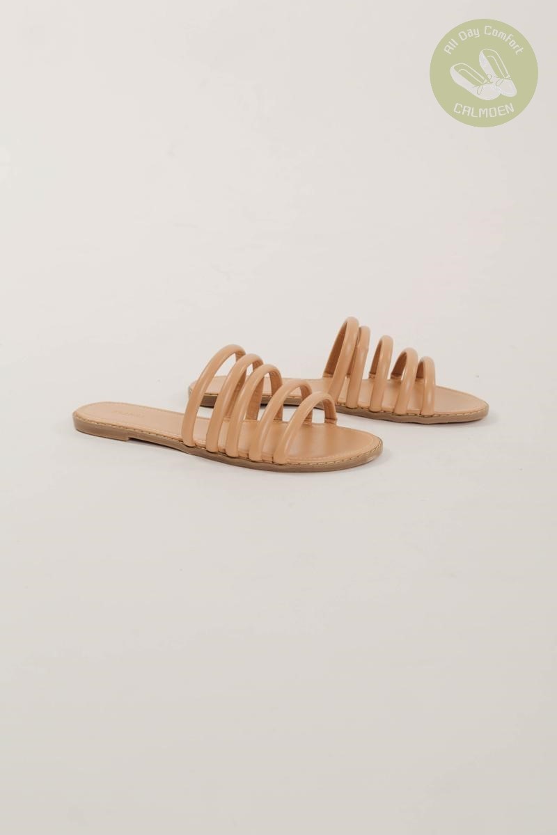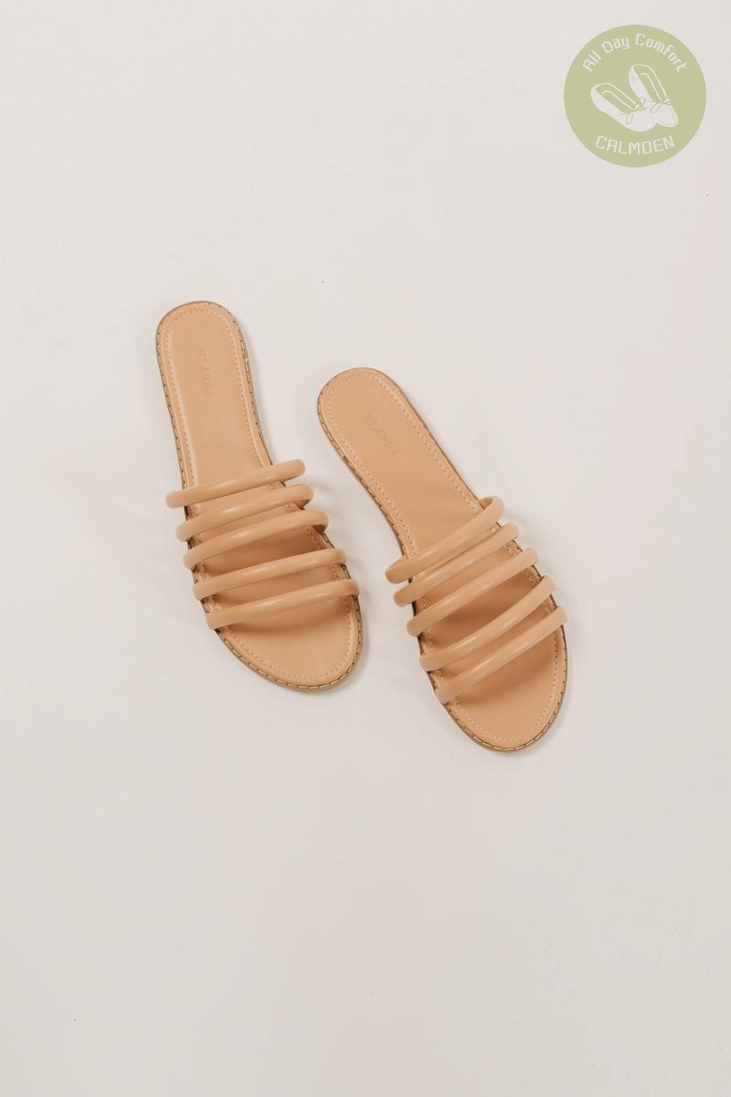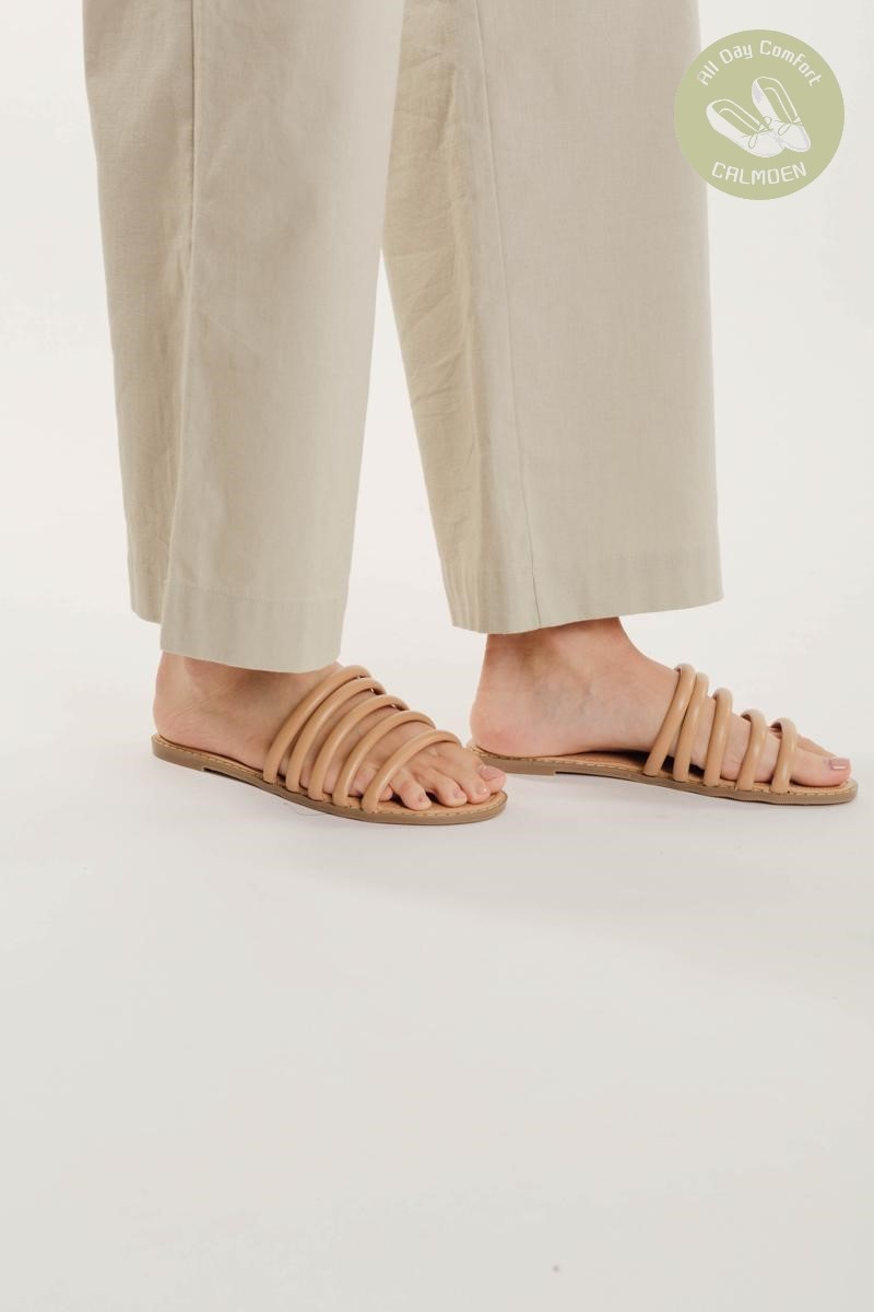 Easy and effortless. the Lana slide is an open toe design with modern tubular straps. Set on a flat sole. take every step in comfort while looking chic when worn with a simple top and wide-legged pants. Available in Sand and Beige.